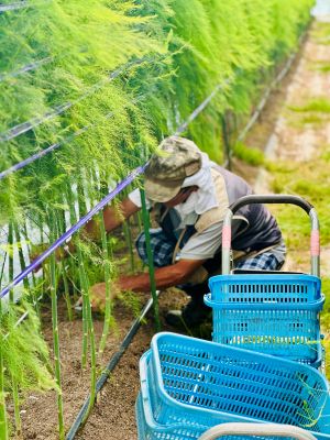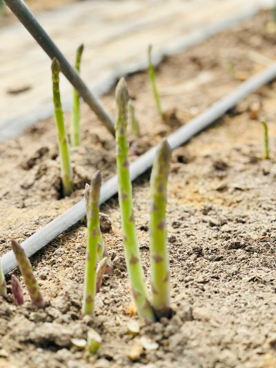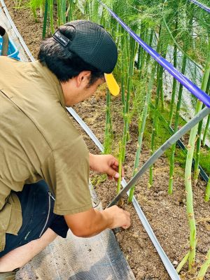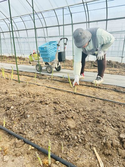 アスパラガス(春芽) 収穫作業 雪解けとともに、地中からニョキニョキと頭を出してきます。 スタッフの丁寧な管理と完熟堆肥の土壌により 甘くてみずみずしい美味しいアスパラが育っています。